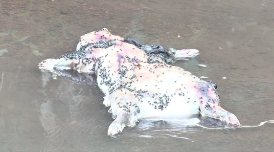 Xác heo cùng rác thải ùn ứ lâu ngày cản dòng chảy khiến khu vực xung quanh thường xuyên bị ngập úng nên bà con trong vùng mong chính quyền địa phương có biện pháp xử lý dứt điểm tình trạng trên.