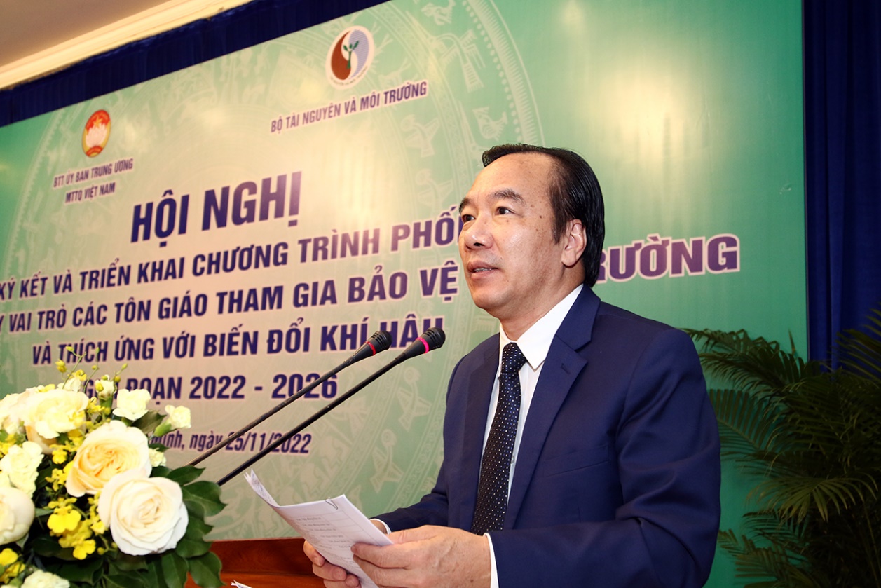 Phát biểu tại buổi lễ, Ông Võ Tuấn Nhân, Thứ trưởng Bộ Tài nguyên và Môi trường, Phó Trưởng ban Chỉ đạo Chương trình phối hợp chia sẻ: Để thực hiện được các chủ trương, chính sách, pháp luật, giải quyết thực tiễn trong nước, quốc tế đặt ra đối với vấn đề BVMT, ứng phó với BĐKH, đòi hỏi sự chung tay, góp sức của cả hệ thống chính trị, cộng đồng và mỗi người dân trong công tác BVMT, ứng phó với BĐKH, trong đó không thể thiếu vai trò hết sức quan trọng của các tổ chức tôn giáo.