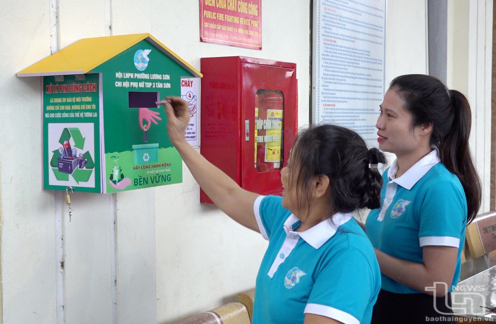 | Phụ nữ phường Lương Sơn (TP. Sông Công) tích cực vận động người dân thu gom pin thải vào “Ngôi nhà pin” để xử lý đúng cách, góp phần bảo vệ môi trường. |