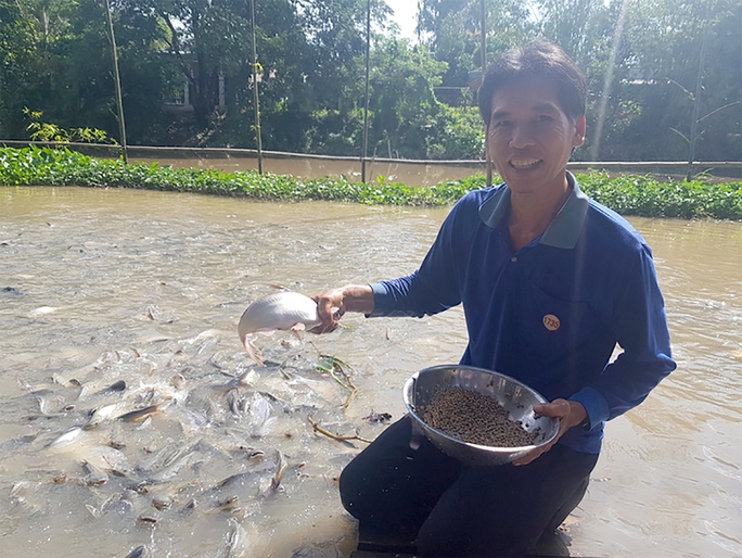 Ông Trần Văn Đặng cùng đàn cá bên bến sông nhà mình. Ảnh: VĨNH KỲ